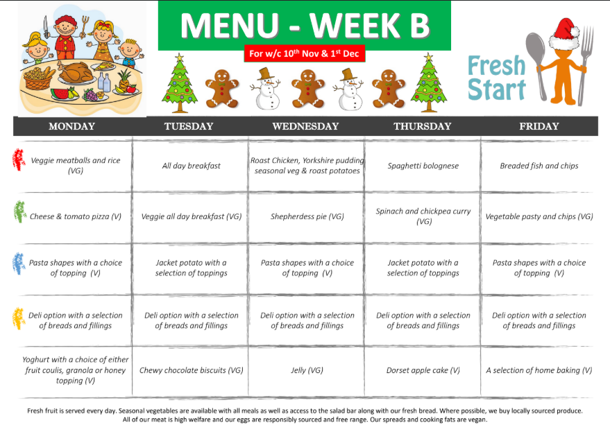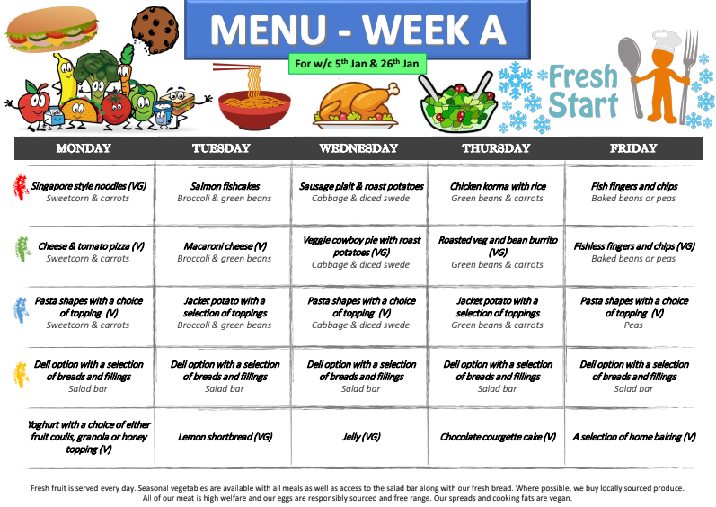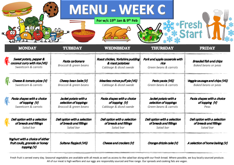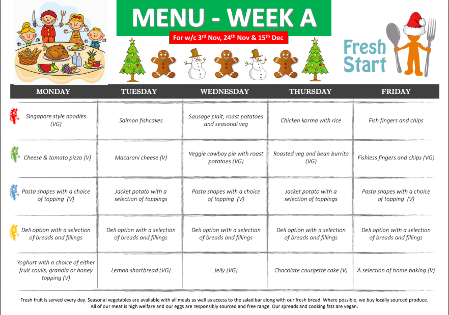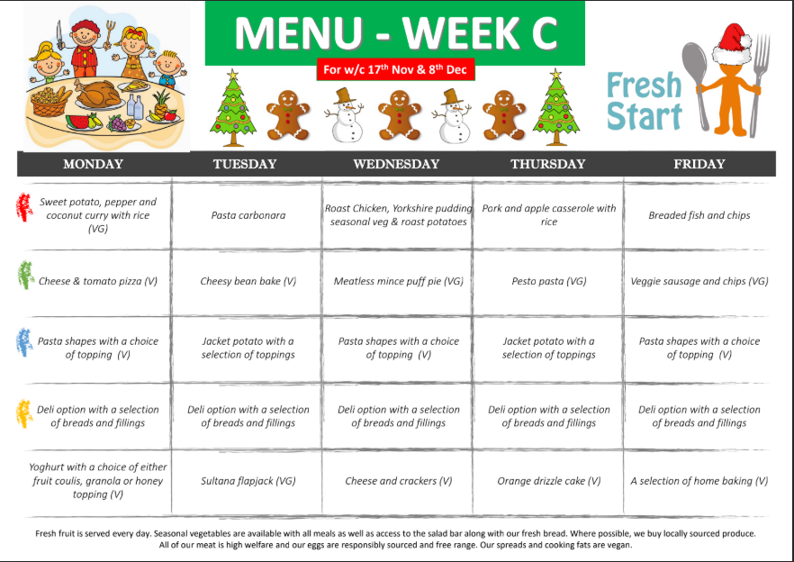 We change our menus every full term with a Spring, Summer and Autumn Menu. Our current menus are shown on our website. https://freshstartcatering.uk/